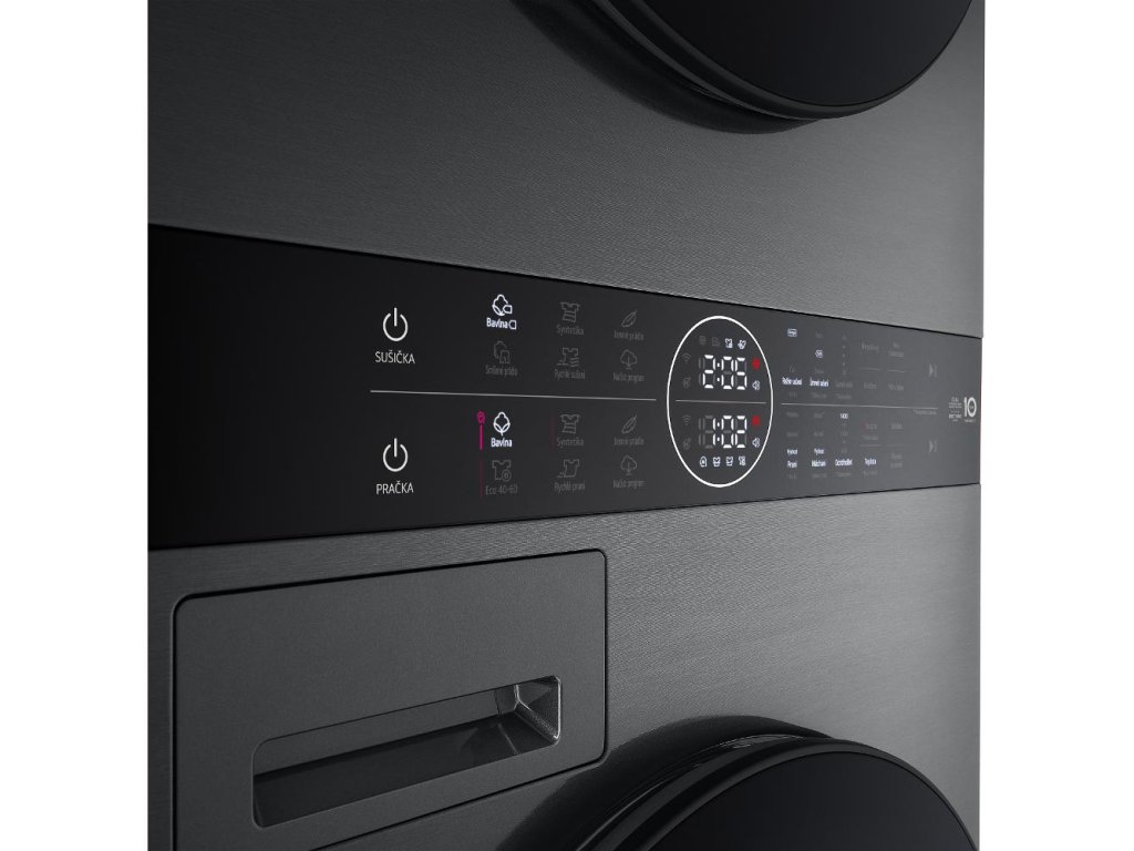 Předpírka, Parní praní, Odložený start (3 – 19 hodin), Dětská pojistka, Pouze odstředění, Zvuková signalizace on/off (pouze v aplikaci), Wi-Fi (stažení programu, dálkový start + Smart Diagnosis), Připravit na sušení (zkracuje čas sušení), Režim sušení (energie/čas), Úroveň sušení (extra, skříň žehlení), Časové sušení, Nemačkavý, Čištění bubnu, Čištění kondenzátoru