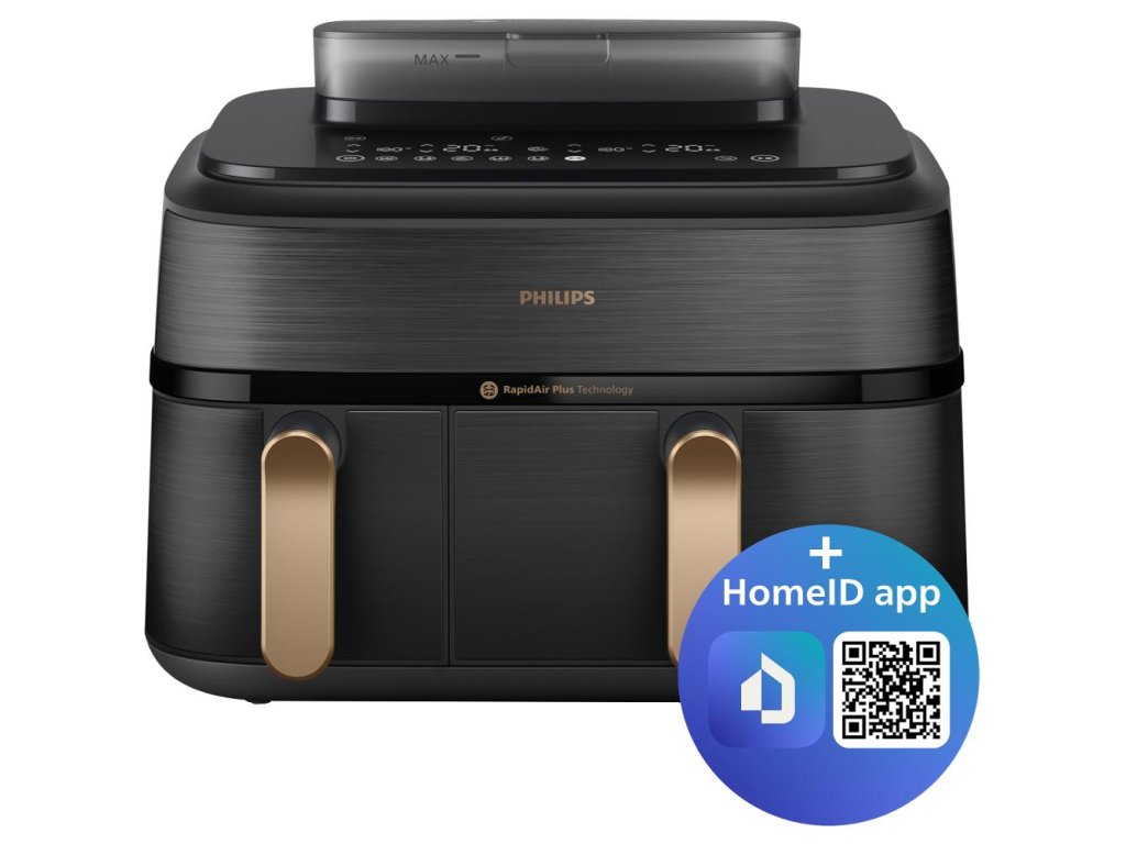 Horkovzdušná fritéza,PHILIPS 5000 Series Airfryer Steam Dual basket 9l NA552/00,,Vždy křupavé, jemné a rovnoměrně uvařené,2 košíky vhodné pro přípravu různých jídel současně,Kapacita 9 l pro celou rodinu,Parní funkce pro šťavnatější a zdravější jídla,Dotykový digitální displej,12 přednastavených programů pro snadné vaření,Snadné čištění v myčce,,Technologie RapidAir Plus pro rovnoměrné vaření s minimem oleje,Funkce synchronizace času a kopírování nastavení,Elegantní černé tělo z nerezové oceli,Aplikace s recepty HomeID,Dvouvrstvé příslušenství pro maximalizaci objemu,,Nepřilnavý povrch,Funkce