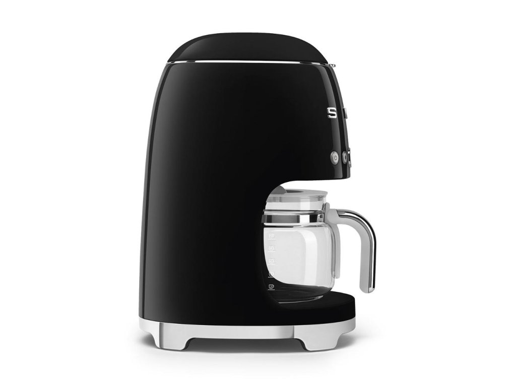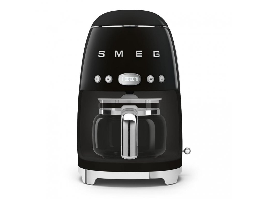 Filtrační kávovar,SMEG DCF02BLEU,,Displej,Ovládání tlačítky,Estetika 50. let,,Kapacita šálků 10,Objem nádoby na vodu 1,4 l,Kapacita karafy 1,25 l,Systém proti kapání,,Nastavitelná tvrdost vody lehká / střední / tvrdá,Alarm odvápění,2 úrovně intenzity kávy,Programovatelný automatický start,,Napětí 220 - 240 V,Frekvence 50 / 60 Hz,Materiál nerezová ocel / plast / sklo,,Rozměry 361 x 245 x 256 mm,Hmotnost 3,4 kg,Barva černá