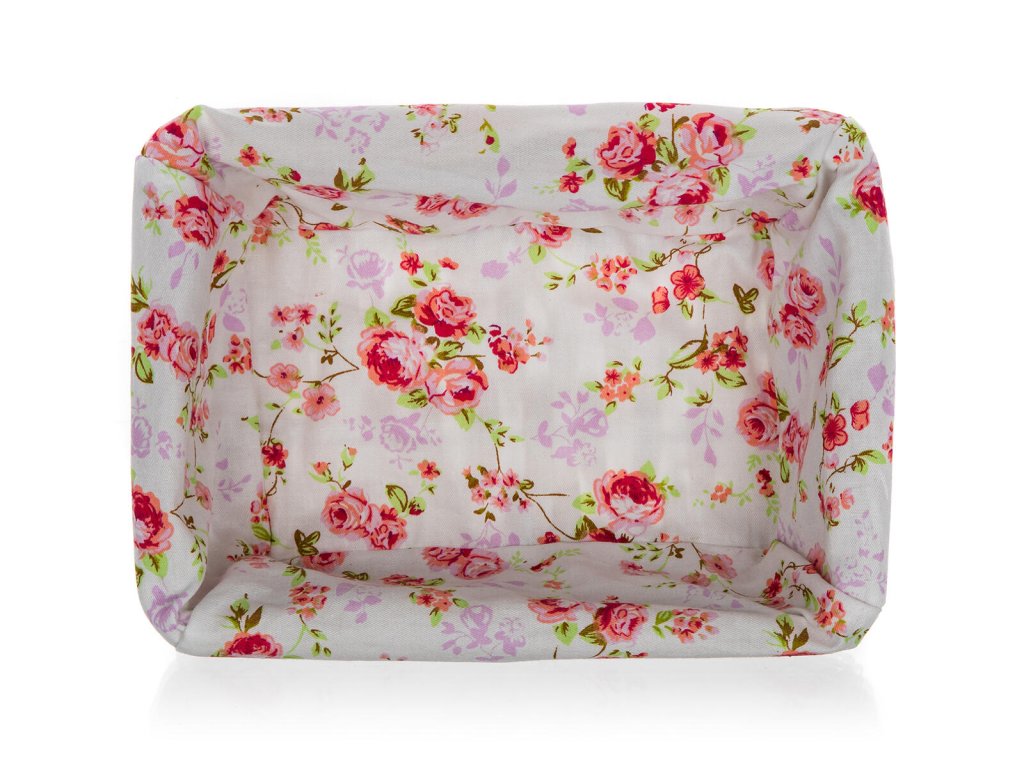 Dodáván v hnědobílé barvě obdelníkového tvaru, uvnitř bavlněná látka s motivem růží a krajkovým lemem.