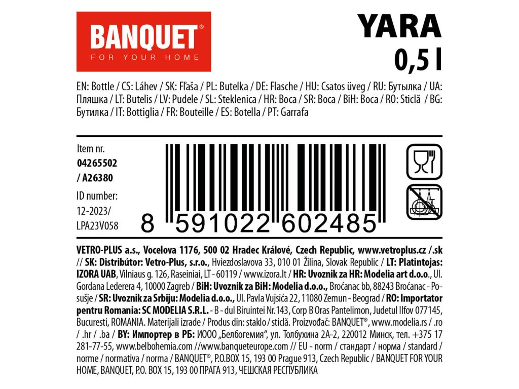 Skleněná láhev YARA 500 ml, hranatého tvaru, s uzávěrem na klip, která se hodí na uchování a servírování domácí pálenky, likérů či sirupů.