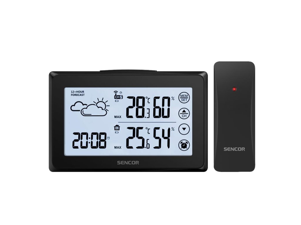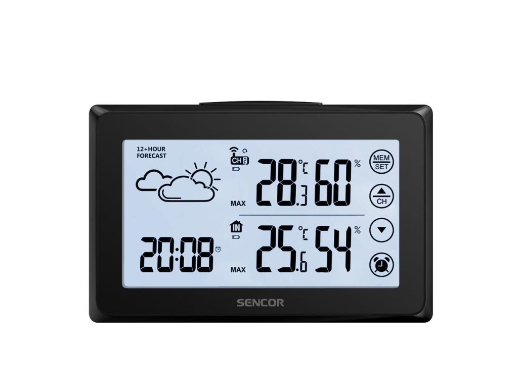 Meteorologická stanice s bezdrátovým snímačem,,Ikona předpovědi počasí ( slunečno, mírně oblačno, oblačno, déšť, sníh ),Vnitřní měření teploty a vlhkosti,Venkovní měření teploty a vlhkosti,Max. / Min. záznamy v paměti,Rozsah měření vnitřní teploty: 0°C až +50°C,Rozsah měření venkovní teploty: -20°C až +60°C,Rozsah měření vlhkosti 20% až 95% RV,Zobrazení stupnice teploty °C / °F,Digitální čas a datum,12 / 24 hodinový formát,Funkce opakovaného buzení,Dotyková tlačítka na obrazovce,LCD displej s krátkodobým bílým podsvícením,3 úrovně jasu displeje: Vysoká / Nízká / Vypnuto,Indikátor vybité bateri
