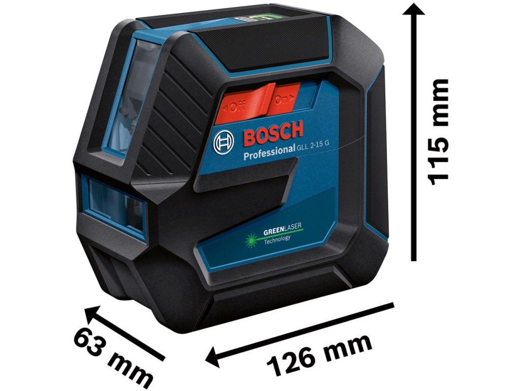 Křížový laser,Bosch GLL 2-15 G 0.601.063.W00,,Pozice,Odolnost a snadné použití. Zelené laserové čáry,,Přínos pro uživatele,Odolná konstrukce s pogumovaným krytem, zapuštěnými skly a ochranou proti prachu a stříkající vodě IP 64 zajišťují výdrž i v drsném prostředí,Vypínač a jednotlačítková klávesnice usnadňují ovládání,Zelený laser pro vylepšenou viditelnost horizontální a vertikální čáry,,Technické údaje,rovozní teplota -10 – 50 °C,Skladovací teplota -20 – 70 °C,Pracovní rozsah, hodnota 15 m,Pracovní dosah až 15 m,Přesnost nivelace ± 0,3 mm/m,Rozsah samonivelace ± 4°,Nivelační doba 4 s,Ochran
