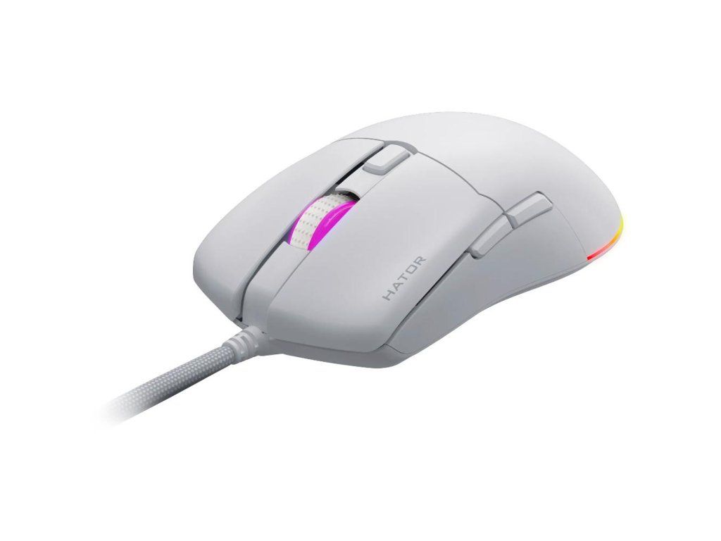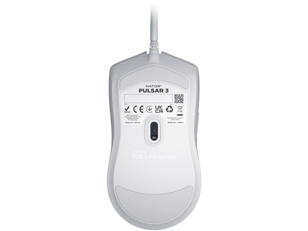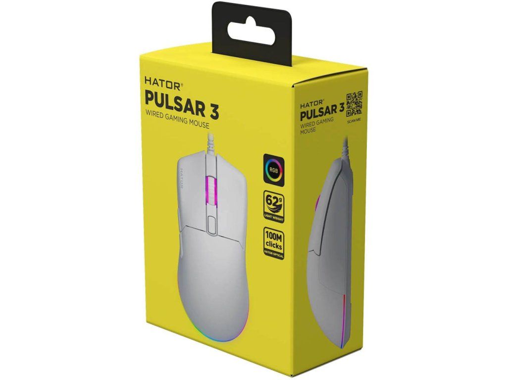 Herní myš,Hator Pulsar 3 White,,Part Number: HTM611,,Provedení myši: Drátová, Herní, Kancelářská,Ergonomie: Symetrická,Připojení myši: 2,4 GHz, Bluetooth, USB-A, USB-C,,Typ senzoru: Optický,Maximální rozlišení: 12000 DPI,Počet tlačítek myši: 6,Model spínače myši: HATOR Optical 100M,Životnost spínače myši: 100 M,,Podsvícení myši: RGB,Výbava myši:,Opletený kabel,Programovatelná tlačítka,PTFE slidery,Uživatelské profily,Vlastní software,Délka kabelu: 1,8 m,,Dotazovací frekvence: 1000 Hz,Typ baterií myši: Interní baterie,,Rozměry (VxŠxH): 38 x 68 x 123 cm,Hmotnost: 62 g,Barva: Bílá