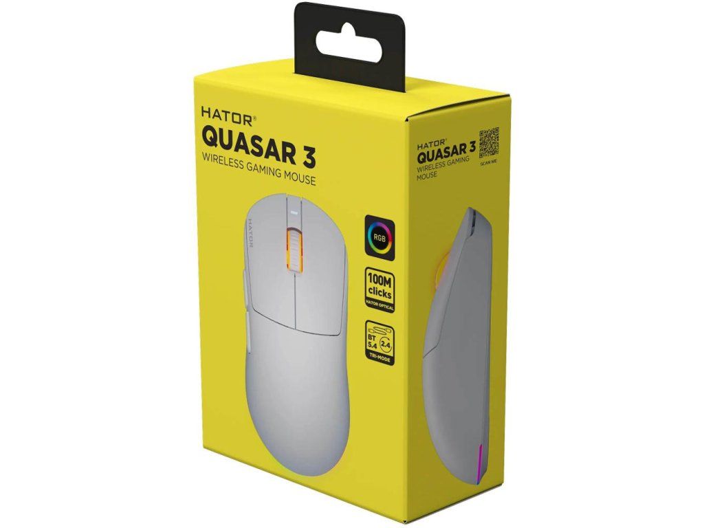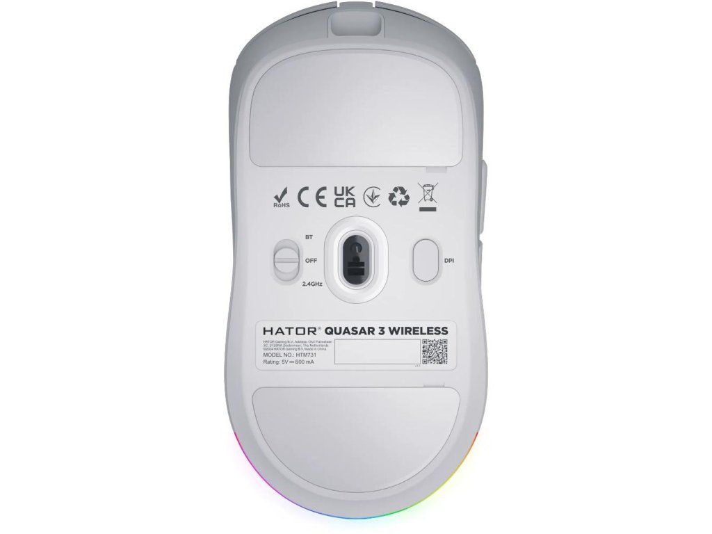 Herní myš,Hator Quasar 3 Wireless White,,Part Number: HTM731,,Provedení myši: Bezdrátová, Herní, Kancelářská,Ergonomie: Symetrická,Připojení myši: 2,4 GHz, Bluetooth, USB-A, USB-C,,Typ senzoru: Optický,Maximální rozlišení: 12000 DPI,Počet tlačítek myši: 6,Model spínače myši: HATOR Optical 100M,Životnost spínače myši: 100 M,,Podsvícení myši: RGB,Výbava myši:,Odpojitelný kabel,Opletený kabel,Programovatelná tlačítka,PTFE slidery,Uživatelské profily,Vlastní software,Délka kabelu: 1,8 m,,Typ baterie: LiPol,Dotazovací frekvence: 1000 Hz,Typ baterií myši: Interní baterie,,Rozměry (VxŠxH): 40 x 64 x