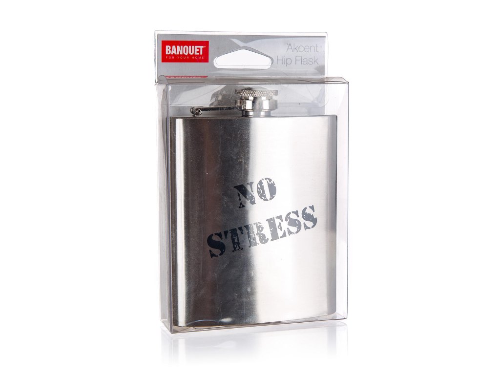 Nerezová placatka AKCENT s potiskem ''No Stress', o objemu 203 ml (7oz) je vhodná na mošty a lihové nápoje.