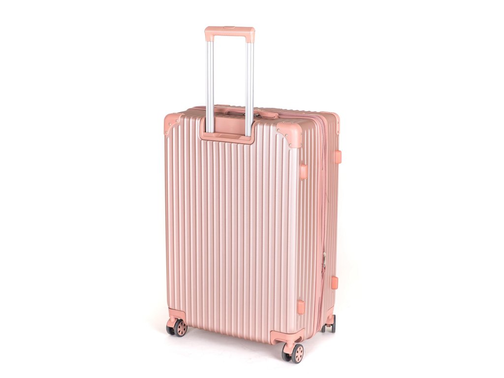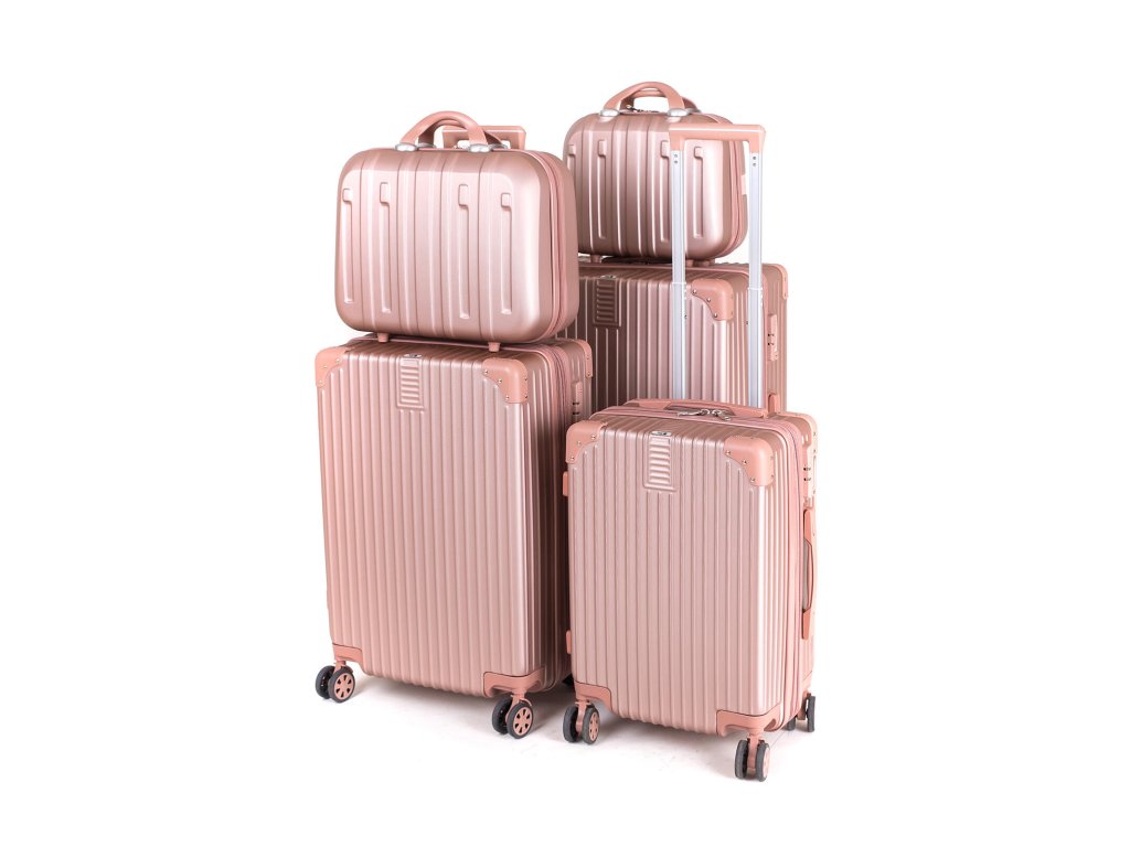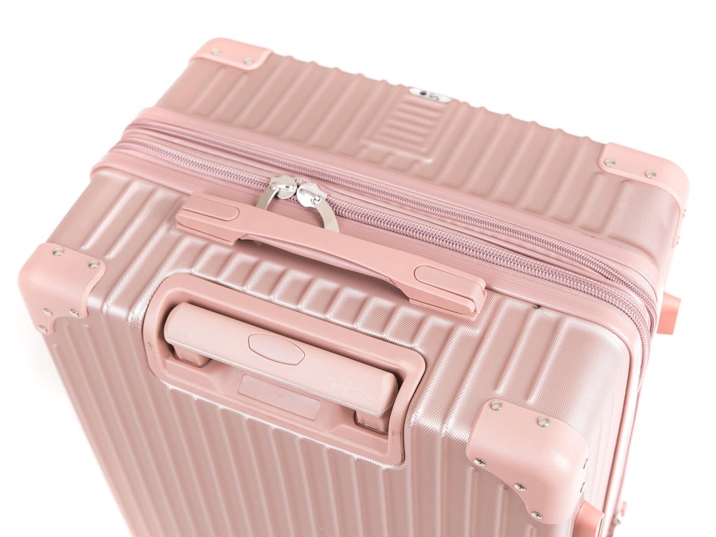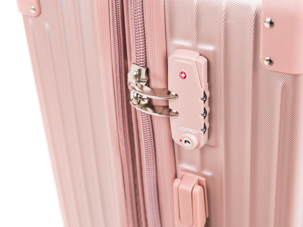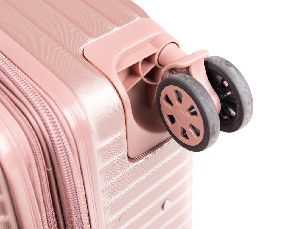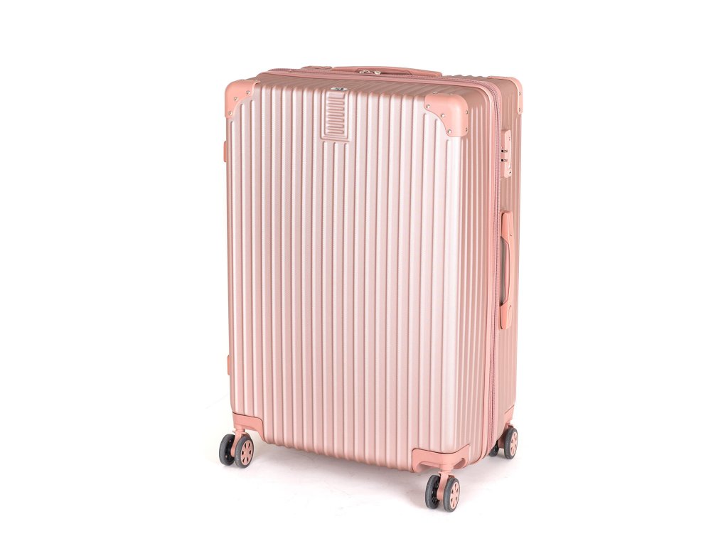 Cestovní skořepinový kufr na kolečkách ABS25, se zpevněnými rohy, velikosti L, ve zlatorůžové barvě, je vyrobený z kvalitního plastu ABS, který je odolný proti nárazu.