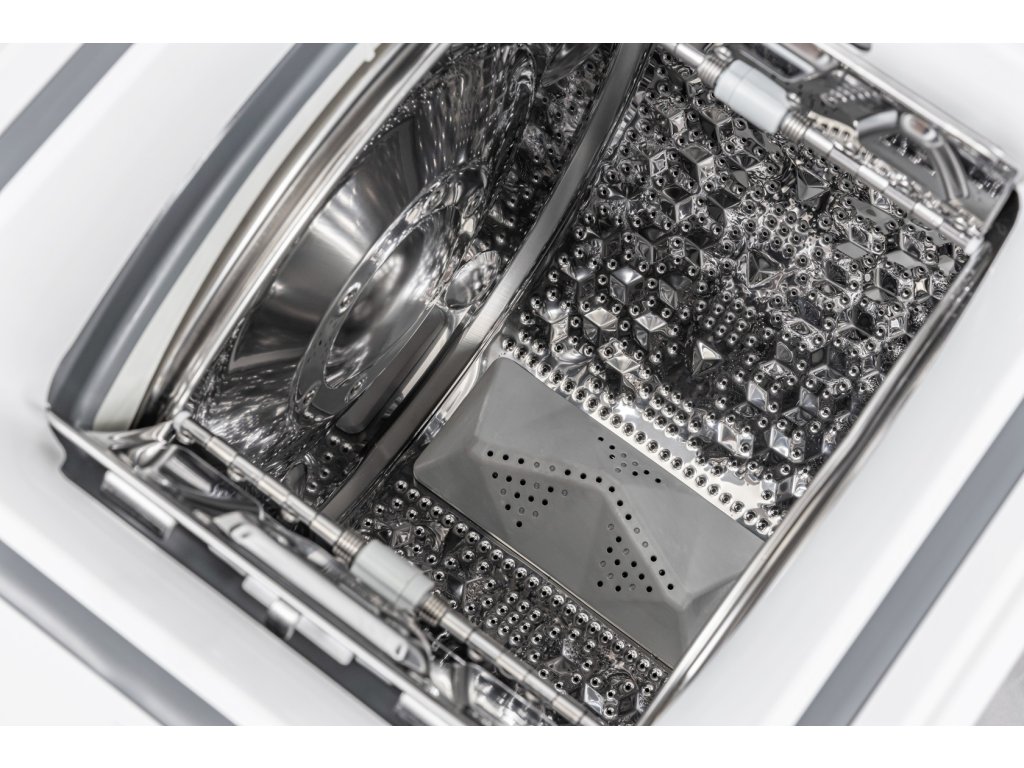 - Komfortní vrchní plnění s funkcí Soft Opening – vrchem plněná konstrukce šetří místo a nabízí pohodlné vkládání i vyjímání prádla. Díky funkci Soft Opening se buben vždy zastaví správně a otevírá se jemně – bez vystřelování či hledání správné polohy.