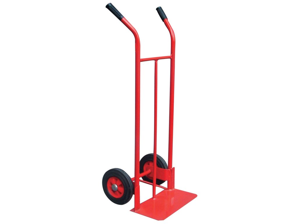 Dvoukolový ruční vozík, ideální pro manipulaci se zbožím v krabicích nebo bednách.