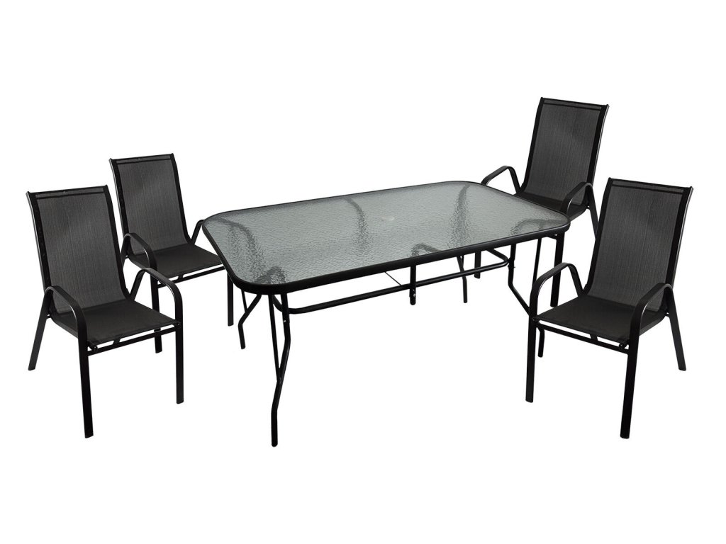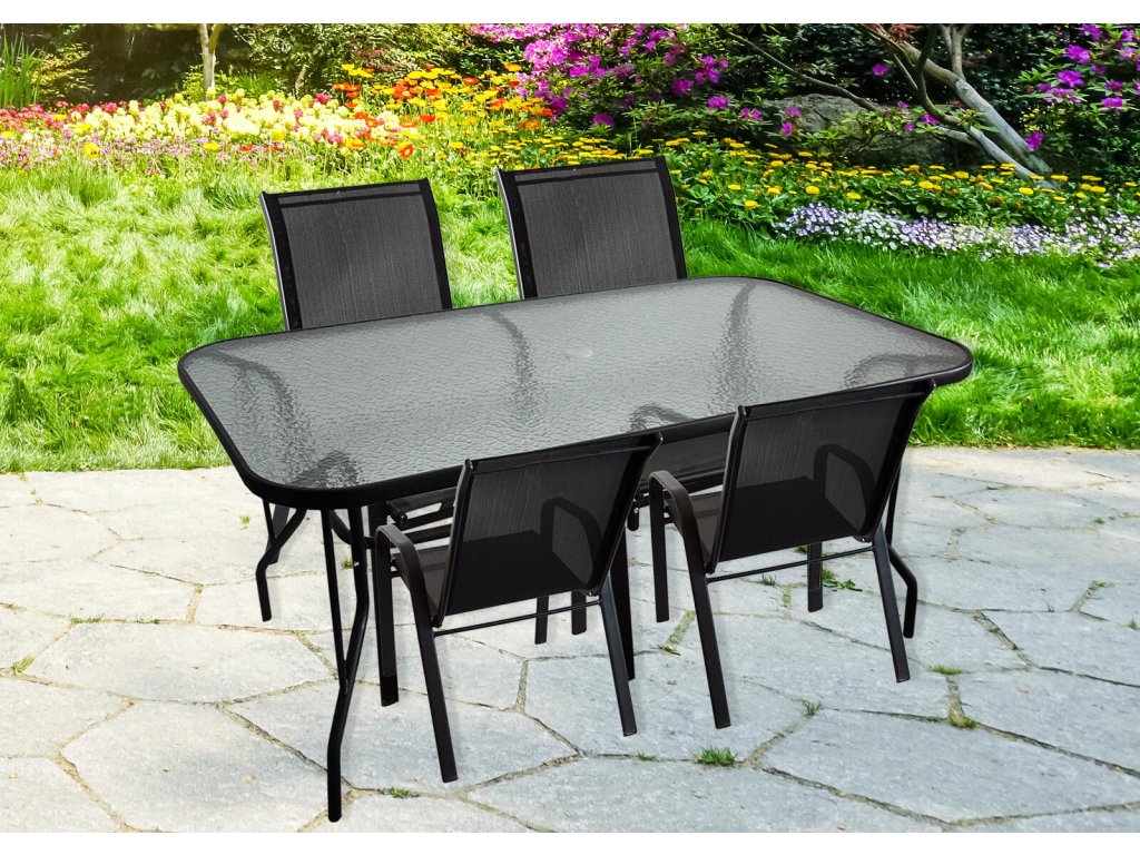 Set zahradní ocel / textilén / sklo, stůl + 4 židle, ČER.
