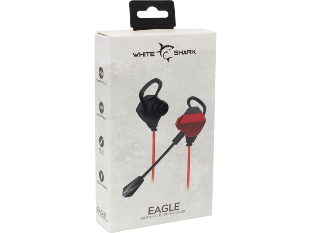 Herní sluchátka,White Shark Eagle Red/Black,,Drátová herní sluchátka,Integrovaný mikrofon,Polouzavřená konstrukce,Připojení přes jack 3,5 mm,,Impedance 16 Ohm,Citlivost 100 dB,Frekvenční rozsah 100 - 1 000 Hz,Délka kabelu 1,2 m,Bez podsvícení,,Tlačítkové ovládání,Jednostranné vedení kabelu,Kompatibilita: PC/PlayStation 5,Hmotnost 27 g,Barva Červená/Černá