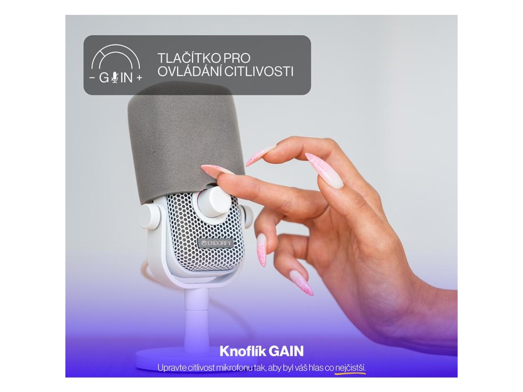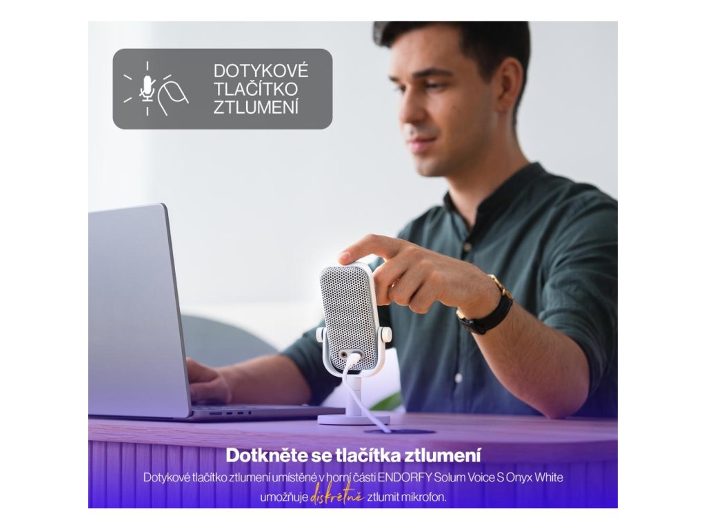 USB-C kondenzátorový mikrofon,Solum Voice S Onyx microph USB-C ENDORFY,,Kardioidní charakteristika pro čistý záznam zvuku,Dotykové tlačítko pro rychlé ztlumení,Ovládání citlivosti (GAIN) pro přizpůsobení hlasitosti,RGB podsvícení s možností výběru barev nebo vypnutí,Obsahuje interní a externí pop filtr,,Frekvence od 30 Hz,Frekvence do 18 000 Hz,Kompatibilní s Windows, macOS, Linux, PS4/PS5 a smartphony s USB-C,,Rozměry 74 × 74 × 170 mm,Hmotnost 235 g,Barva bílá
