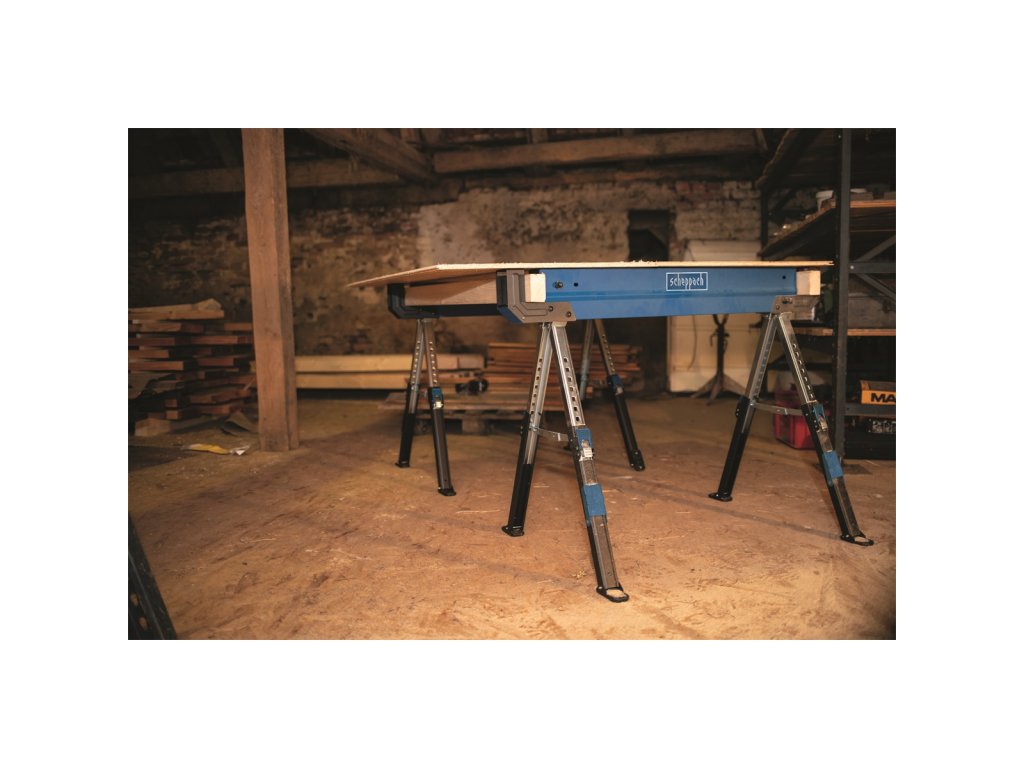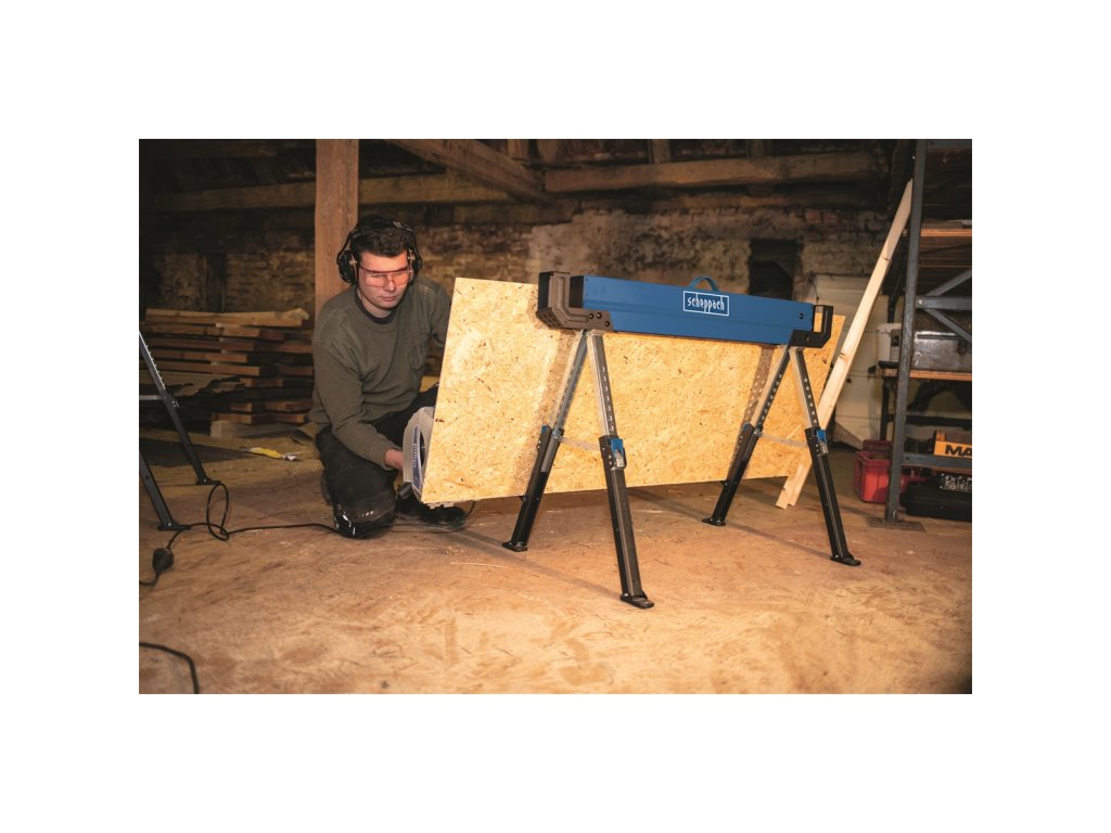 MWB 600 - skládací stavební koza 600 kg Pokud potřebujete rozšířit pracovní plochu nebo vytvořit provizorní pracovní stůl na zahradě, v garáži nebo na stavbě, stavební koza Scheppach MWB 600 je na to ideální pomocník. Snadno a rychle ji rozložíte, přenesete, kam je potřeba a vytvoříte pomocí promyšlené konstrukce velkou pracovní plochu, použijete kozu jako podpěru nebo stojan na upravovaný materiál apod. Možnosti jsou široké. Můžete rovněž pospojovat větší množství podpor a vytvořit tak opravdu velkou plochu. Celá koza je navíc výškově nastavitelná, má výkyvné nožičky opatřené gumovou vrstvou, takže je možné ji umístit i na nerovném povrchu, horní strana je opatřena protiskluzovou vrstvou, boční nohy jsou opatřeny sklopnou zarážkou, o kterou lze opřít jakoukoliv desku, má okrajové úchyty pro zasunutí dřeva a z horní strany je opatřena praktickou rukojetí. Nosnost dvojice je až 1200 kg. Celá konstrukce je vytvořena z vysoce kvalitní oceli.