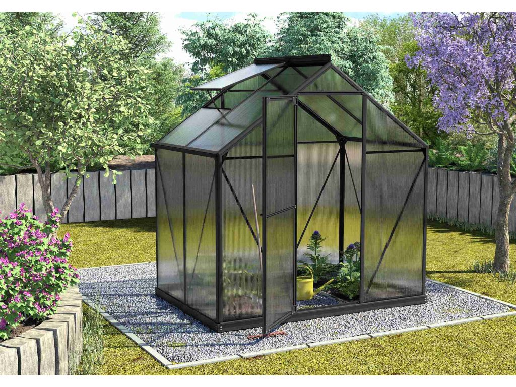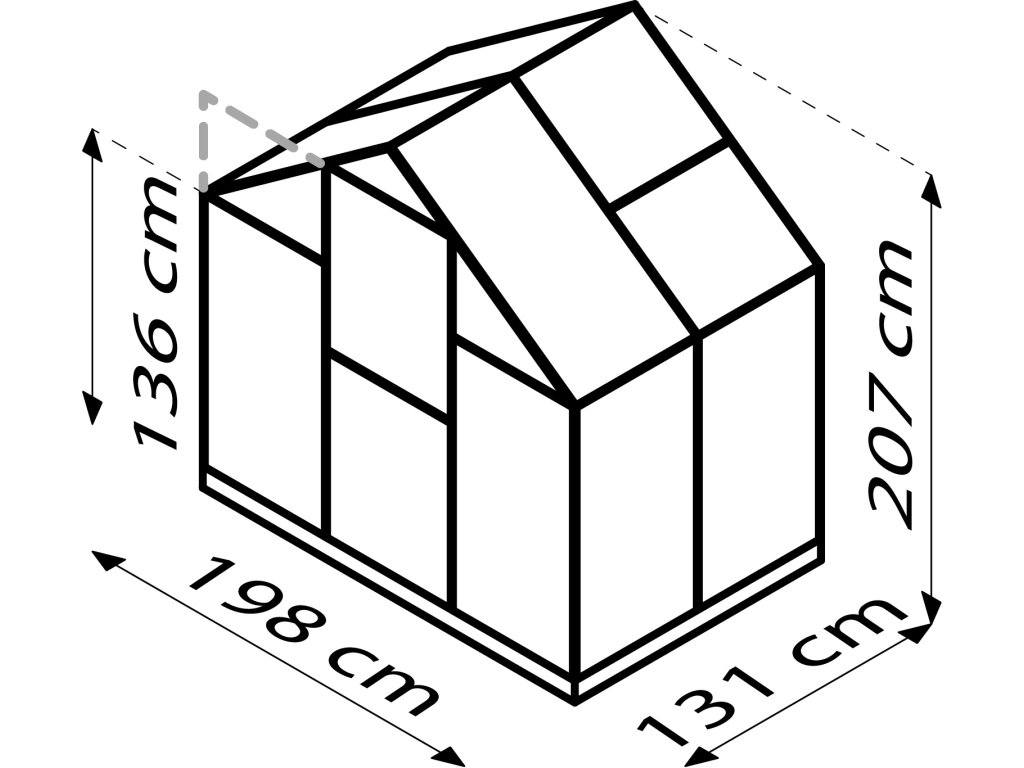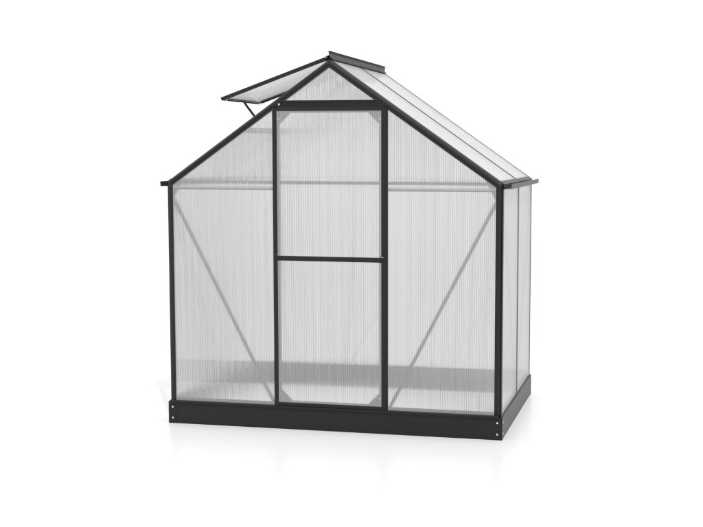 Hliníkový skleník, š 198 x d 131 cm, černý, 1x stř. okno, polykarbonát 4 mm, dveře na pantech, plocha 2,59 m2.