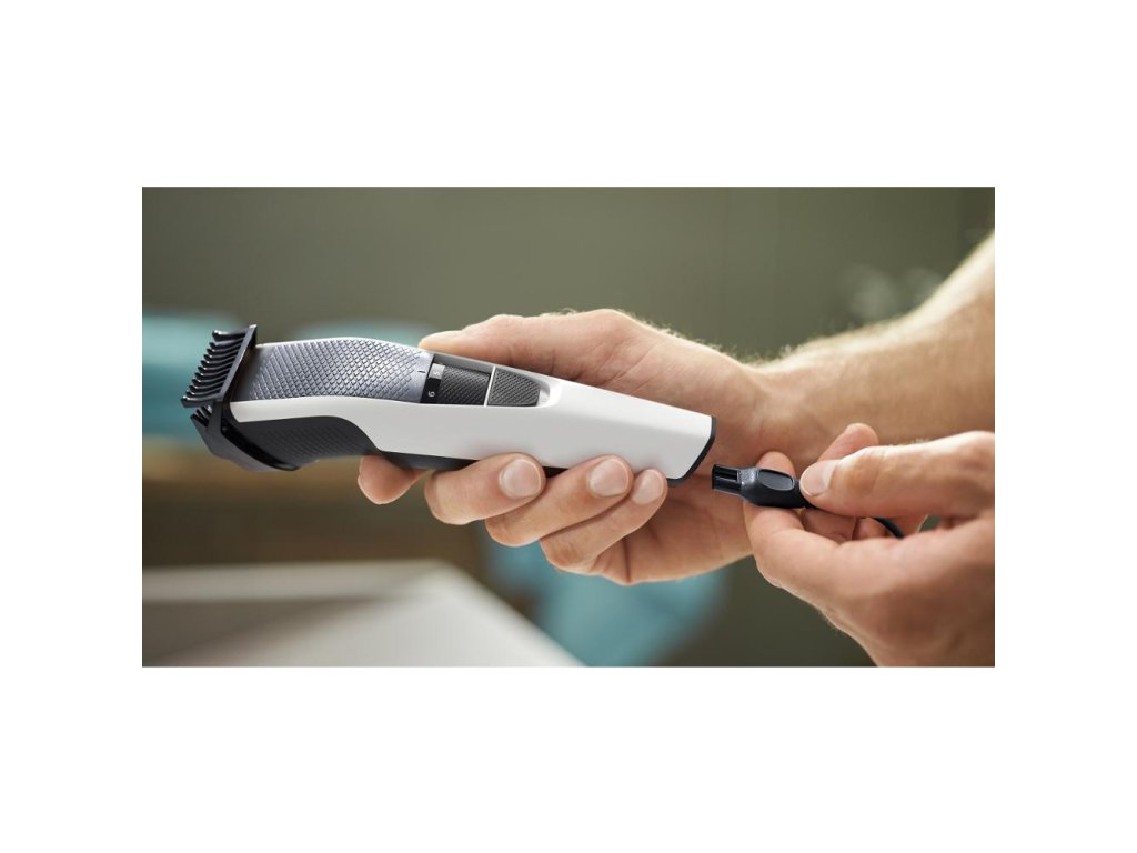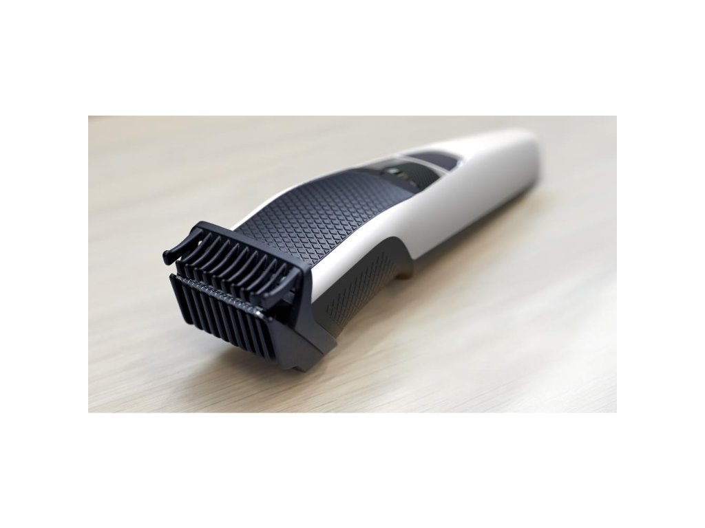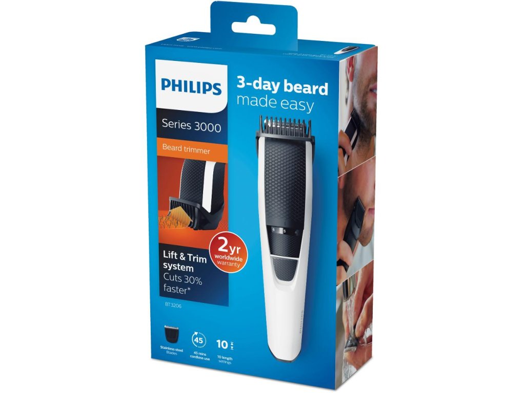 Elektrický zastřihovač vousů Philips řady 3000.,Systém Lift & Trim.,Samoostřicí ocelové břity.,Nastavení délky střihu kolečkem na jednu z 10 délek od 1 do 10 mm.,Hlavu zastřihovače je možné odejmout a oplachovat pod tekoucí vodou.,Indikátor nabití baterie.,Výdrž: 45 minut/10 hodin nabíjení.,Bezdrátové použití.,Barva: bílá,Příslušenství: čisticí kartáček.
